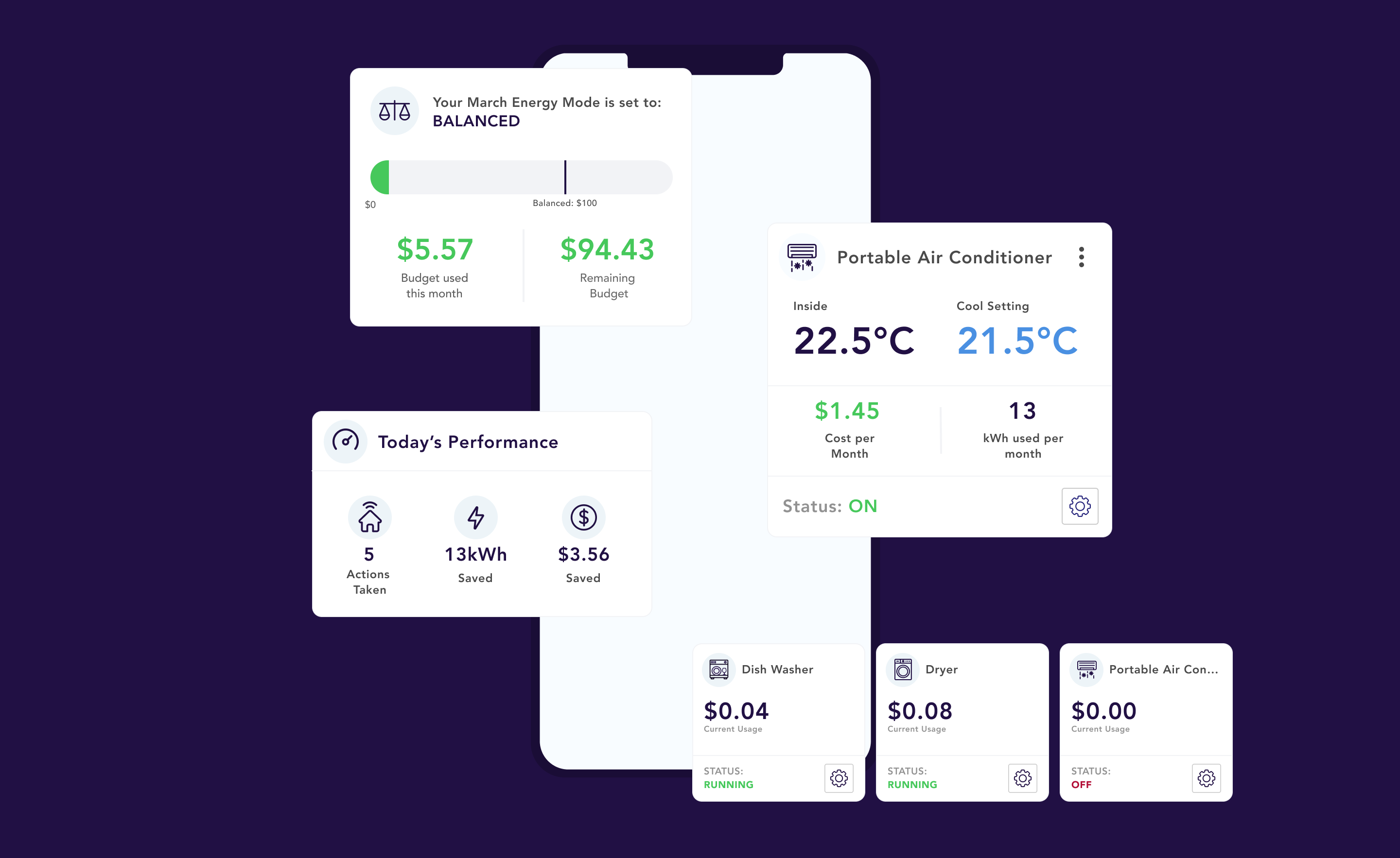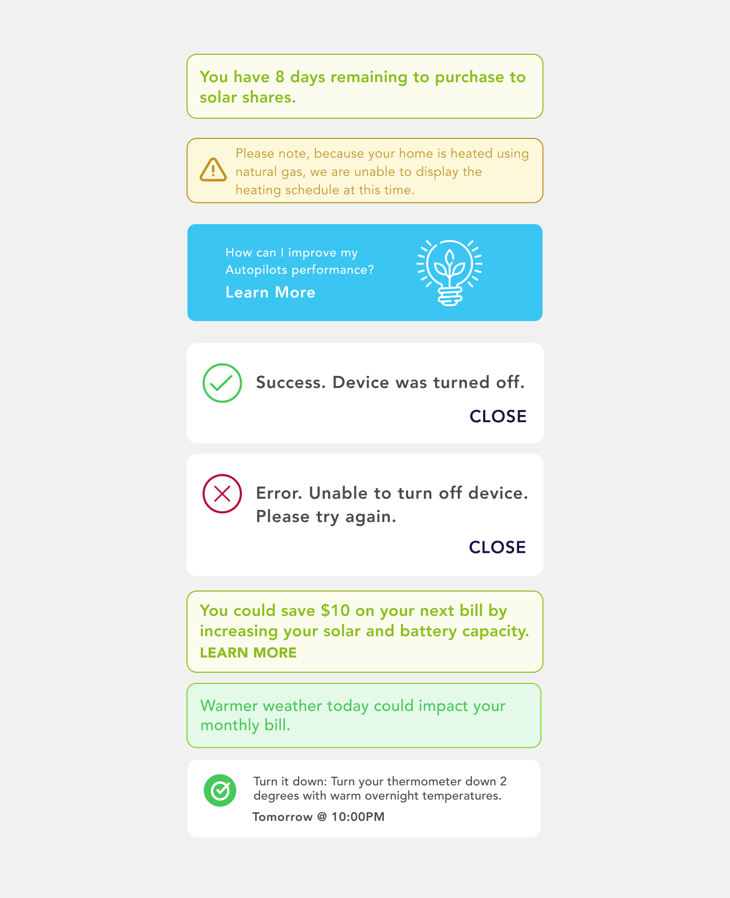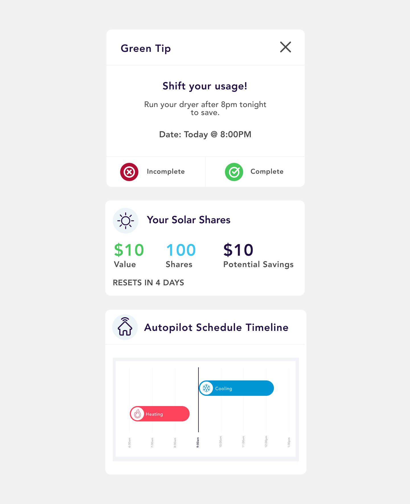 Cards to separate and organize different blocks of information for scannability allowed users to act on important items quickly. Grouping of cards at the top of the screen provided high-level overviews and recommendations, helping users act on real-time energy tips and tools to reduce or shift home energy usage. Establishing reusable design elements was critical in ensuring I could design and build quickly and consistently.