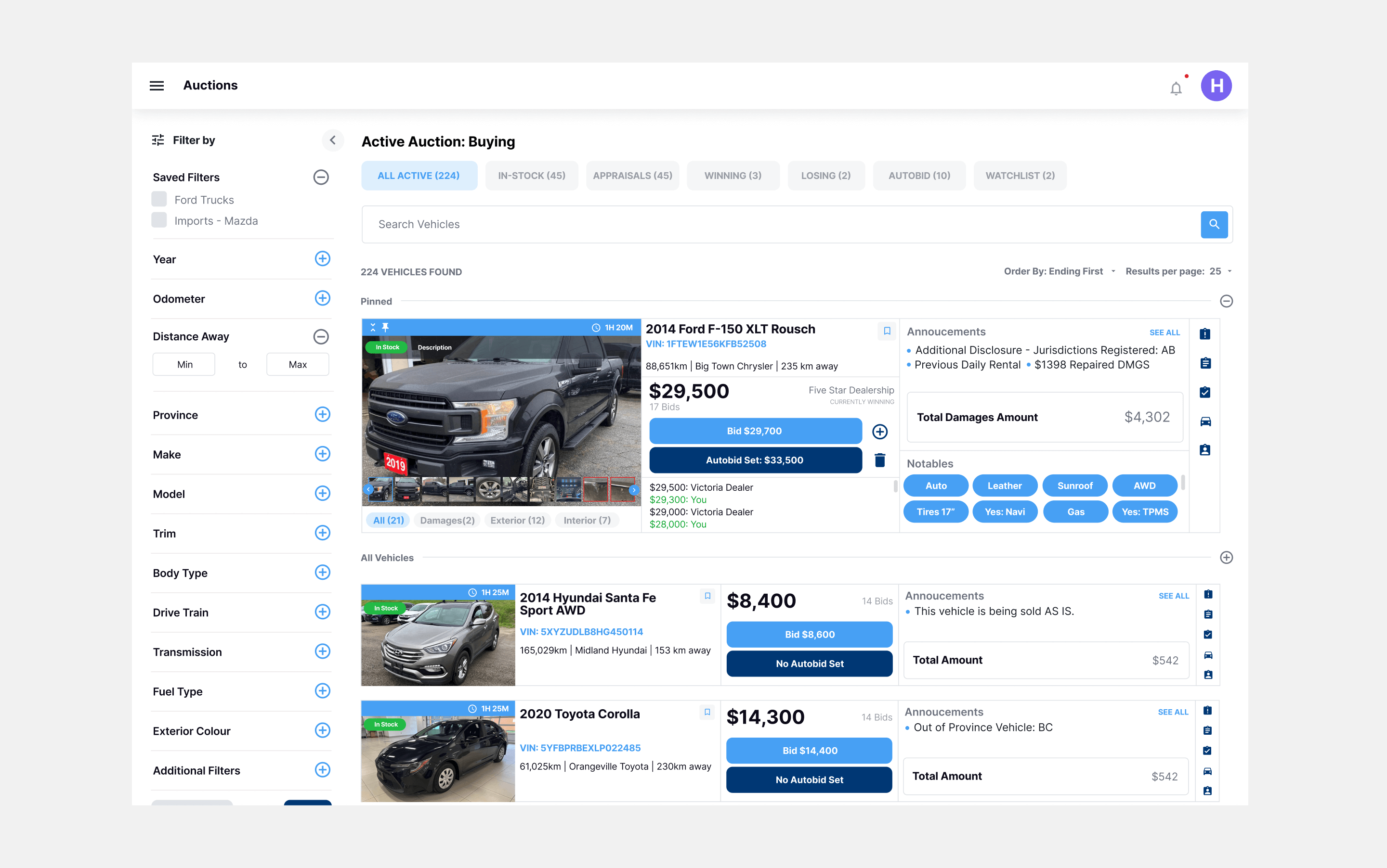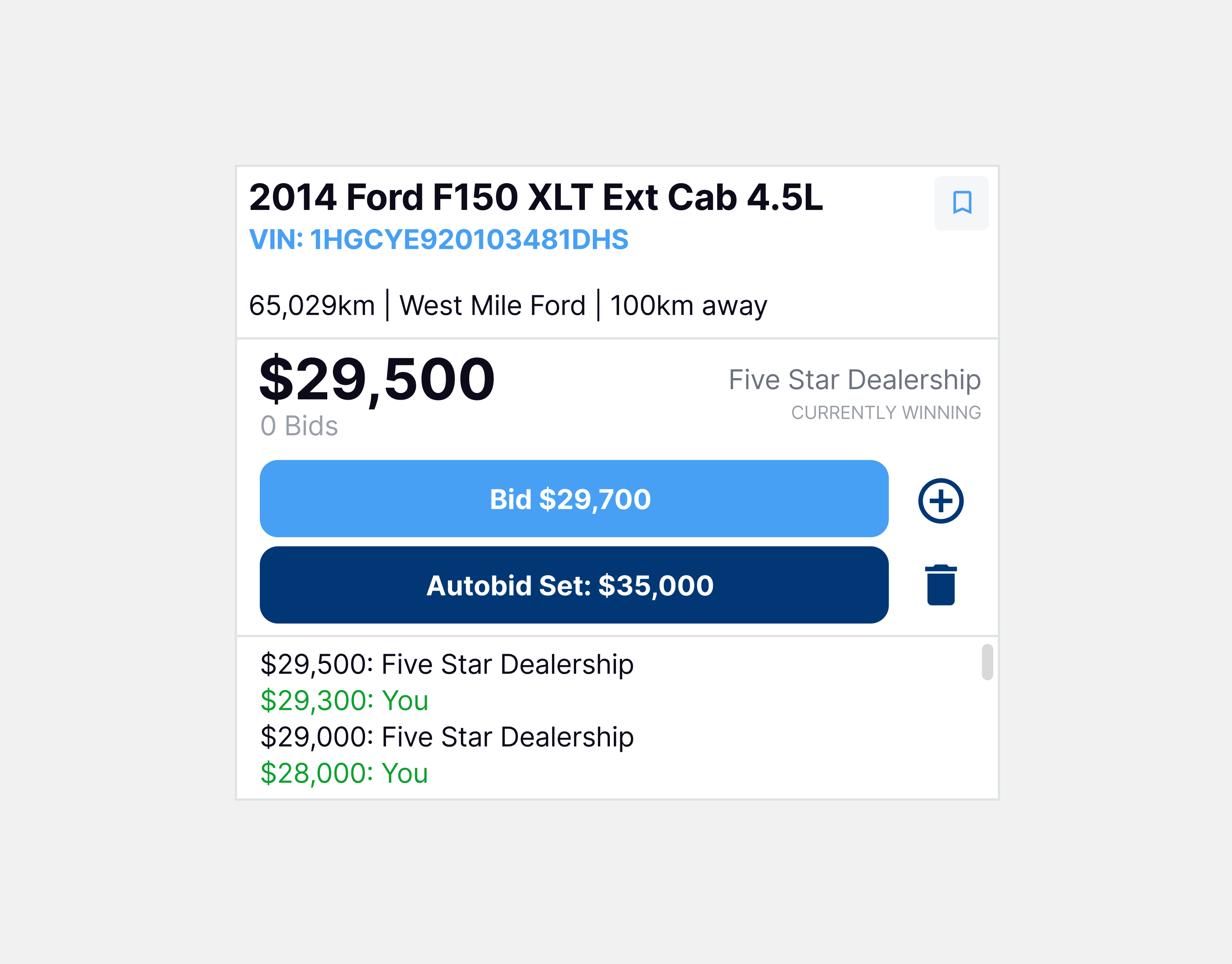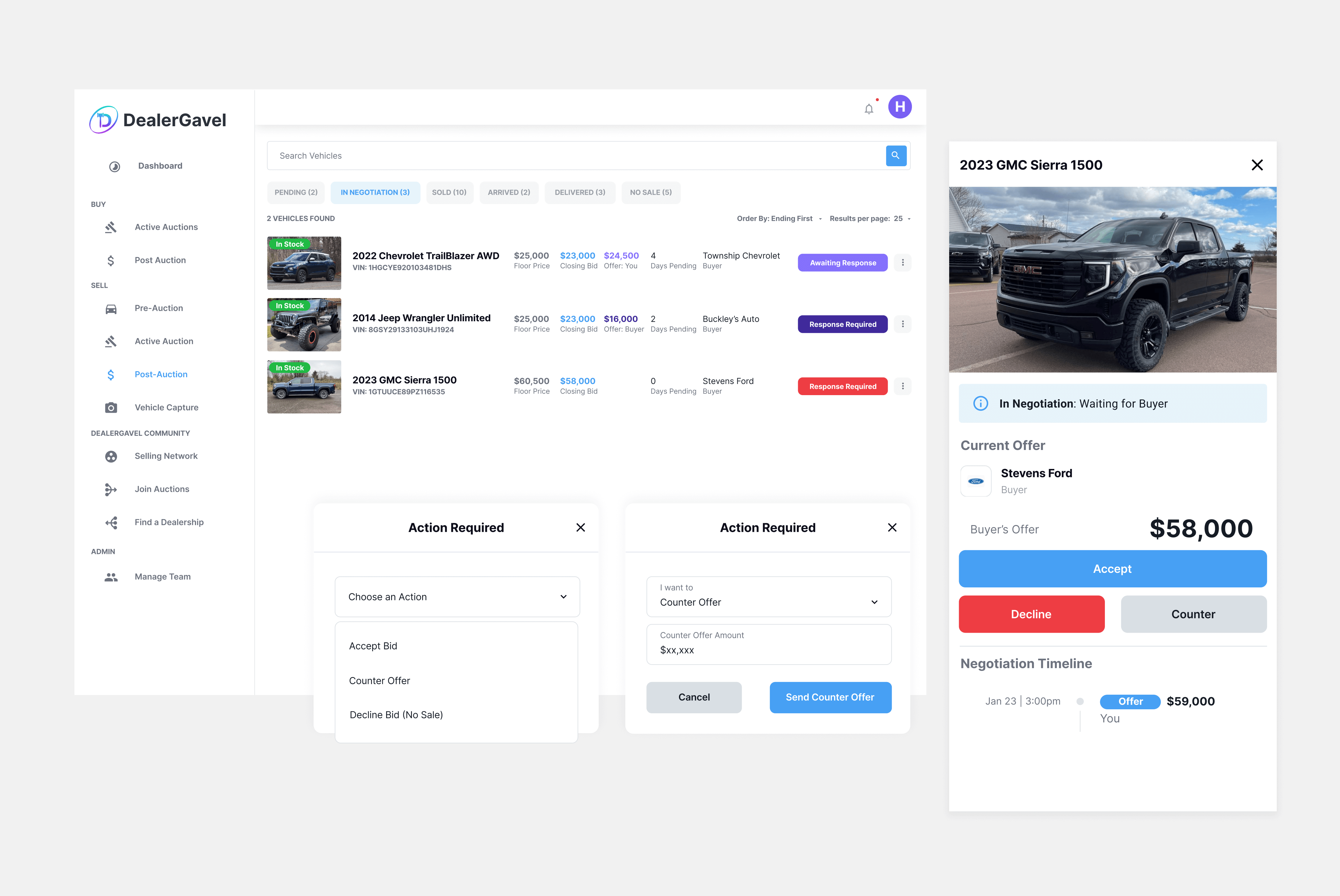 Dealergavel’s primary feature is the live auctions that allow dealerships to buy and sell inventory. Buyers needed a smooth bidding experience with clear information about current bids, bidding history, vehicle information, with preferred features like automatic bidding. Sellers needed to be able to monitor bids on their items in real-time, receive notifications of new bids, and manage bids effectively.