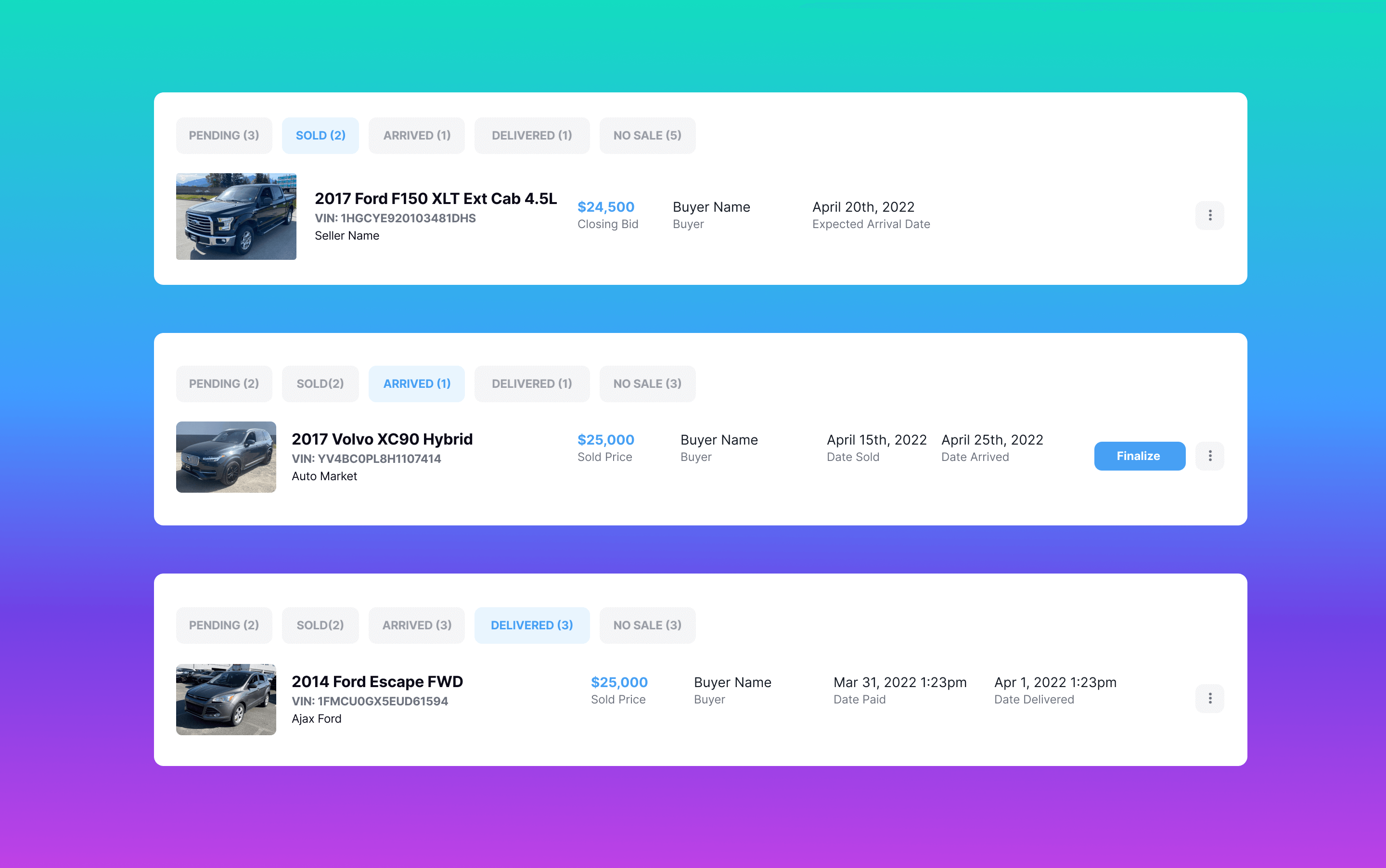 Post-Auction Vehicle pages enabled customers to view and manage all their purchases and sales throughout the entire post auction journey, in one centralized place.