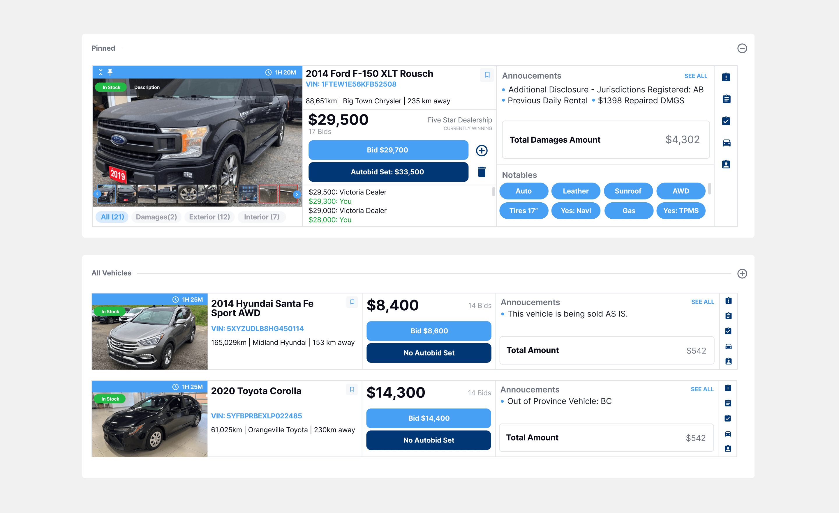 Even though the platform is made exclusively for dealership employees with high cognitive load tolerance, it was important to reduce workflow complexity. Features such as vehicle pinning, expandable vehicle display, and a VDP drawer ensured that each vehicle display presented necessary features with elements that supported efficiency and accuracy in a face paced and time restricted setting.
