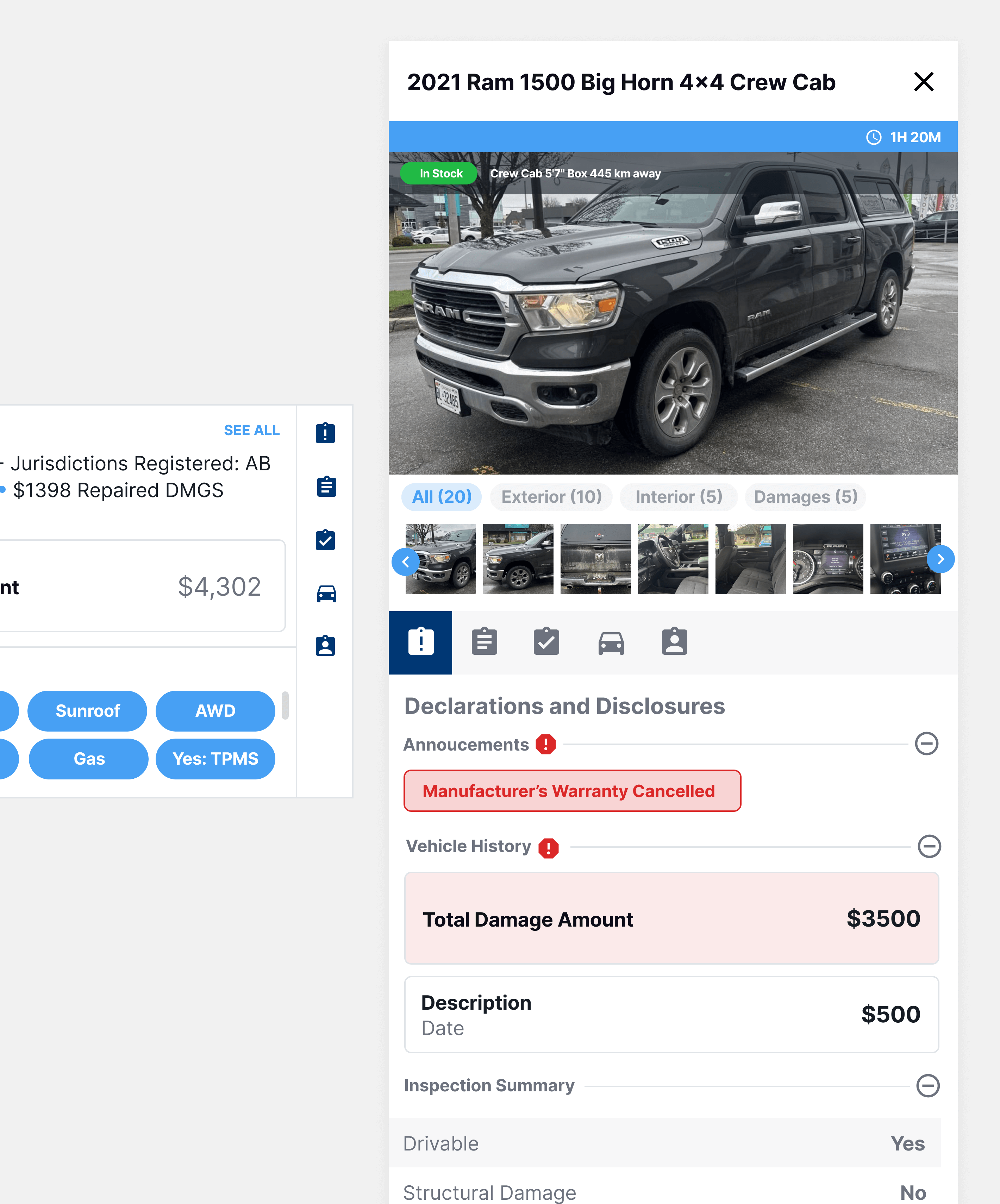 Once vehicles are added to the platform, the information is displayed on a vehicle details page. Typically, VDPs are literal web pages that a user has to navigate to. Wanting to keep users in the same workflow, Dealergavel’s VDPs were implemented into a drawer component. These drawers could display the hundreds of details available about a particular vehicle, while remaining compact and accessible from any page the vehicle exists on. Using a drawer system allowed buyers to act quickly and confidently, finding vehicle information in a few short steps, while bidding in real-time,