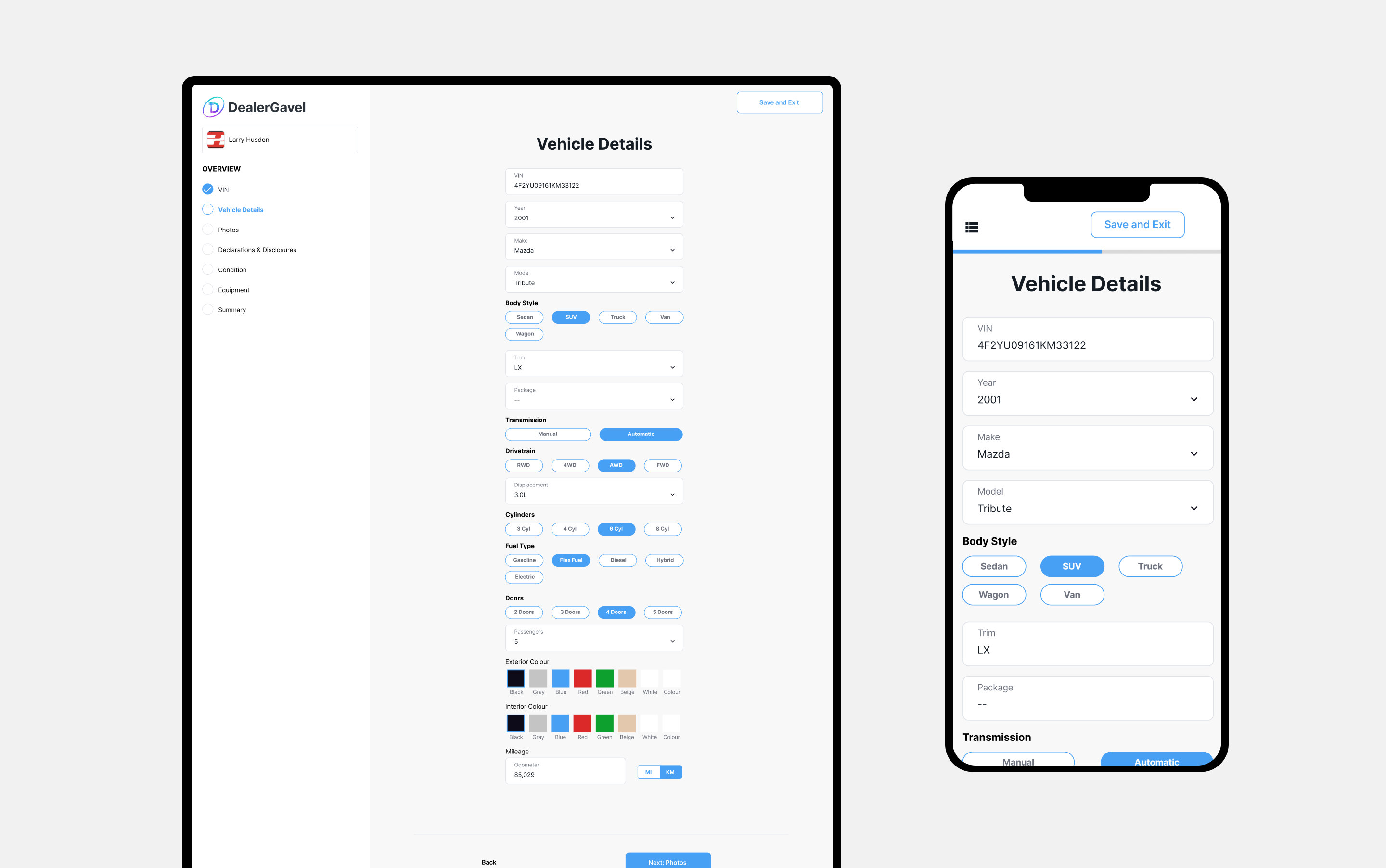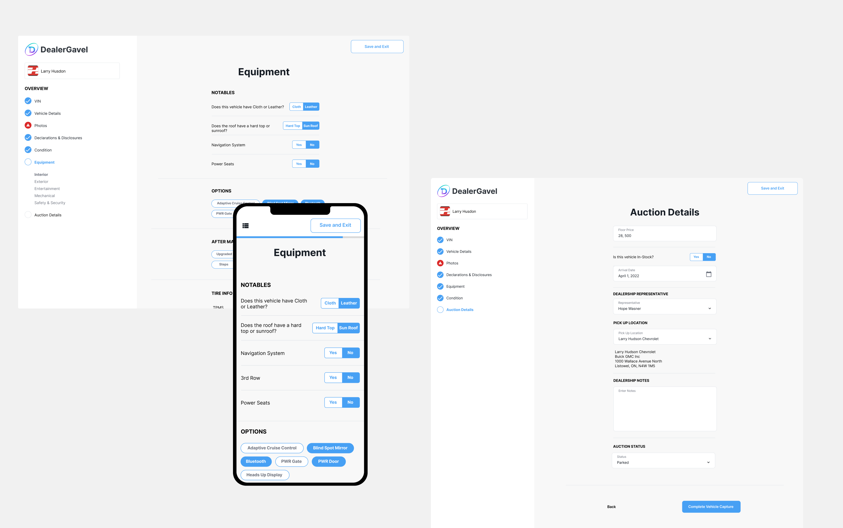 Creating a step-by-step workflow to add vehicle details broke down information into digestible pages and groupings. Workflow steps remained nearly identical from mobile to desktop, making it easy for users to complete various steps on the platform of their choosing. Working with the development team, we implemented a number of mechanisms for verifying that all necessary vehicle information was included, ensuring accuracy and completion before moving vehicles to auction.