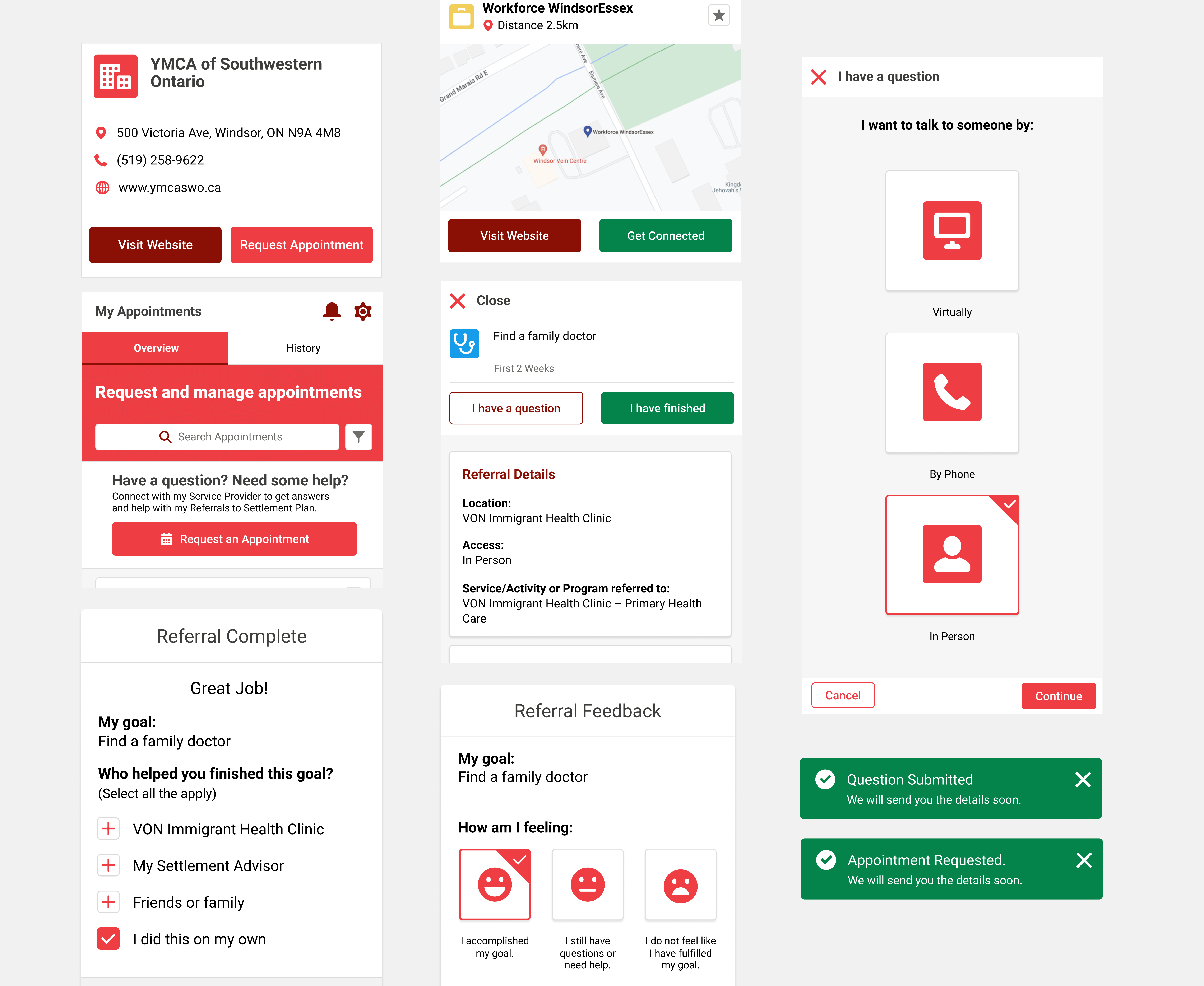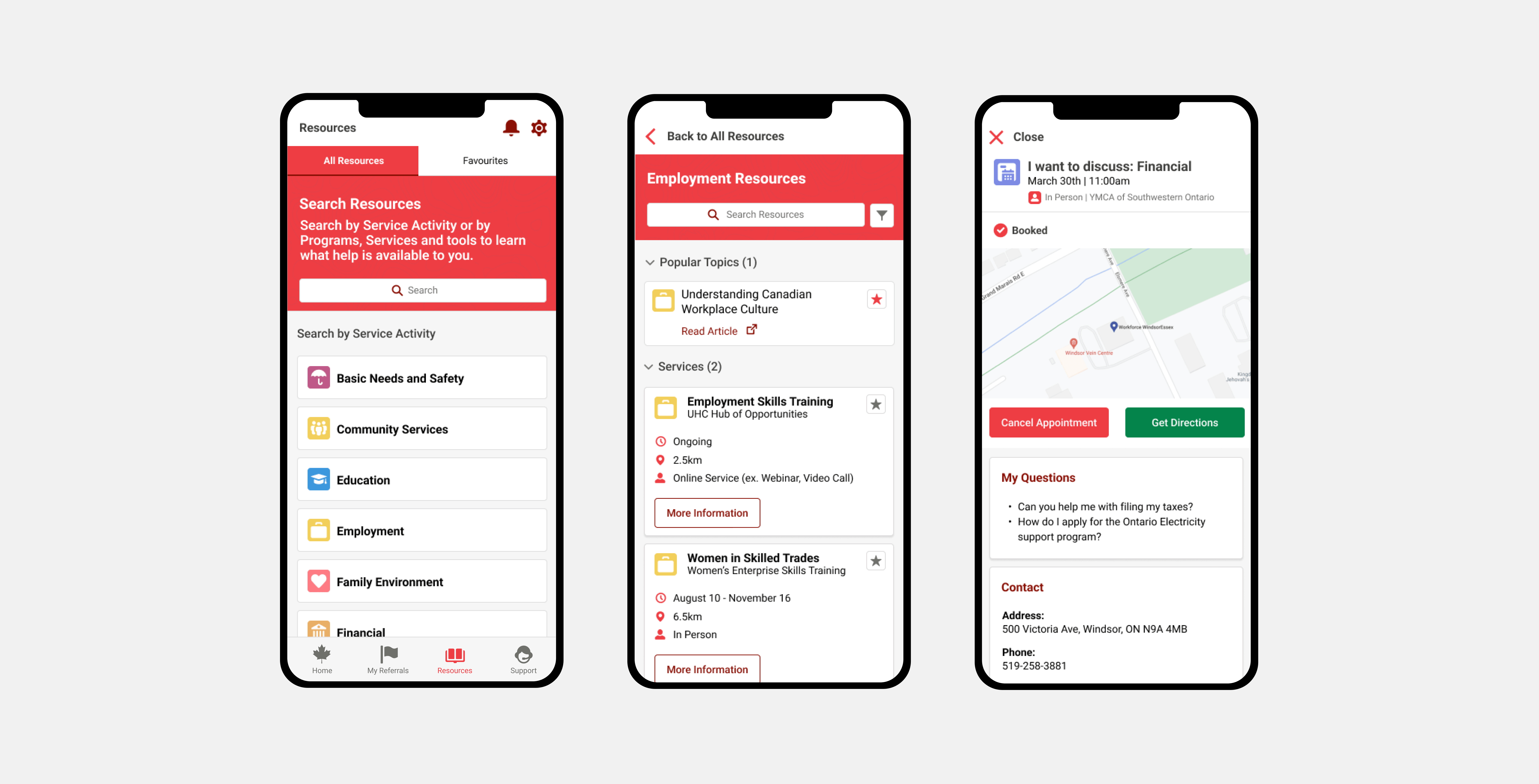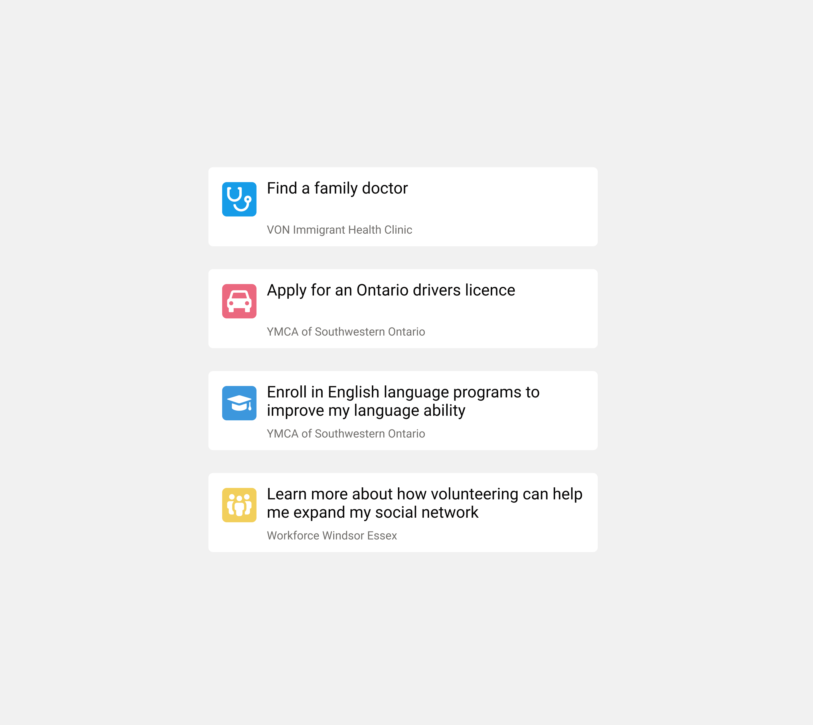 An application goal was to reduce friction and support clients appropriately for the challenges that are unique to the needs of each individual newcomer and their families. Throughout the platform, we provided clear CTA (Call-to-Action) elements for users who want to connect to service providers. CTA’s allowed clients to create and discover opportunities, as well as get direct help with any issues that arose as they worked on their service plan.