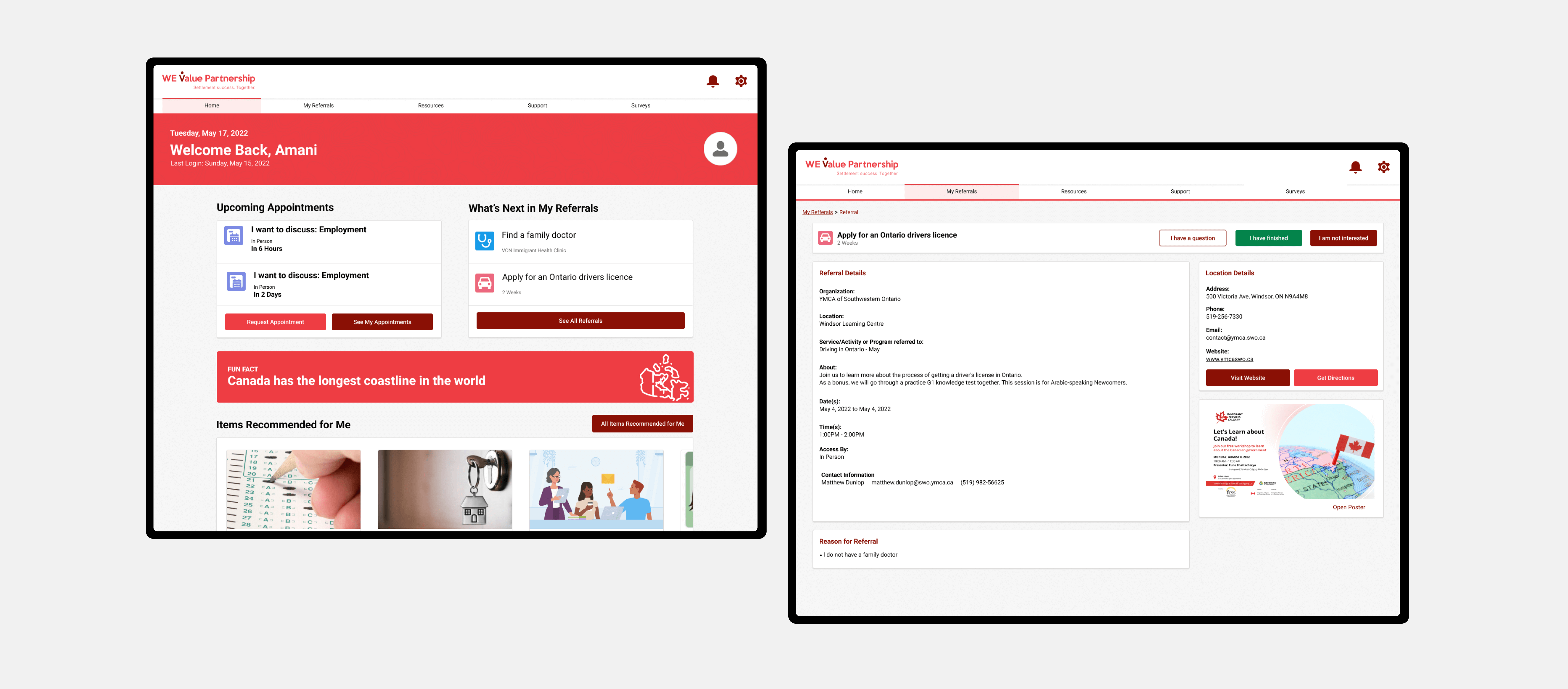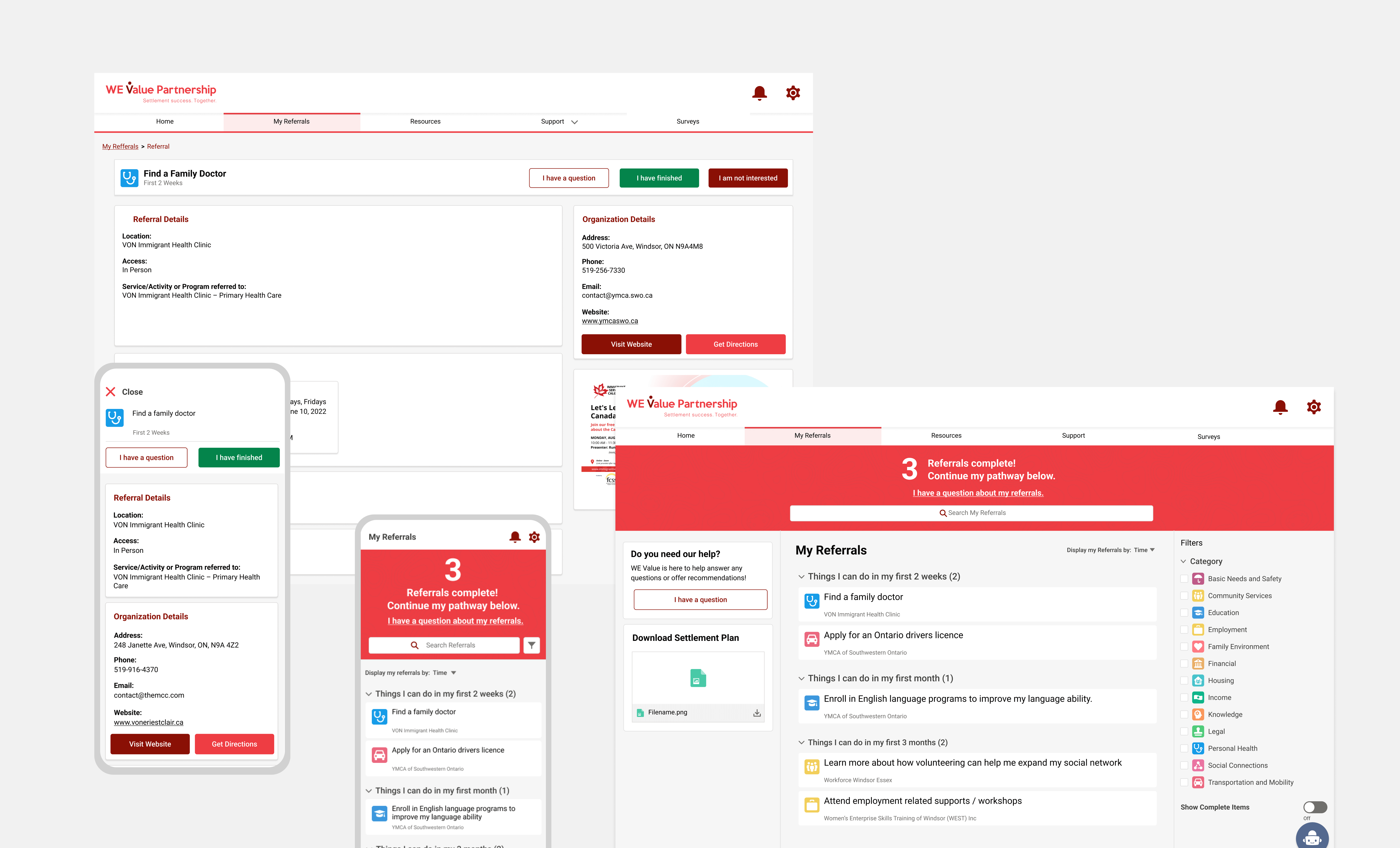 I was engaged by the WEValue team to design the user experience and user interface for a mobile and desktop portal that utilizes Salesforce Experience Cloud and that is scalable for multiple communities, providing resources to service clients with a diverse range of needs. Starting with several discovery meetings with key stakeholders, we developed a plan to conduct a number of user studies with existing WeValue clients to better understand their needs and pain points. My team used a combination of user questionnaires and focus groups to reach a broader range of newcomers with different backgrounds, lengths of time in Canada, and technical skill levels. After numerous meetings to review all the user feedback, the main goals for the portal redesign were decided: