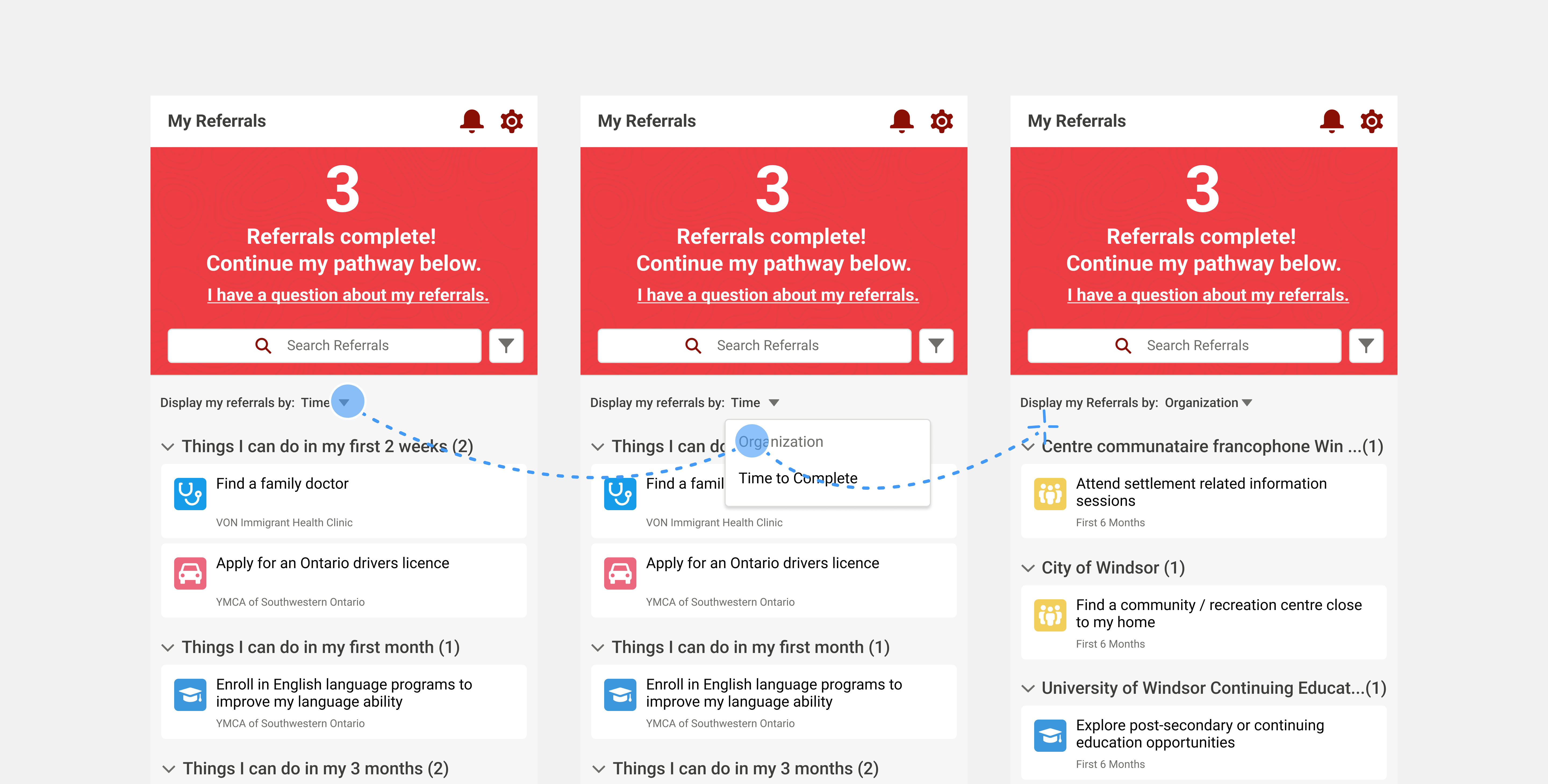 Filters also provided the ability to organize goals by due date or organization name. Due date allowed users to quickly view time sensitive goals (eg. Obtaining a health card), while organization name would help show goals that were grouped by different service providers. Users could also select which service types they wanted to target. Service categories were assigned unique colour and icons that made them easily recognizable, providing visual consistency throughout the portal.