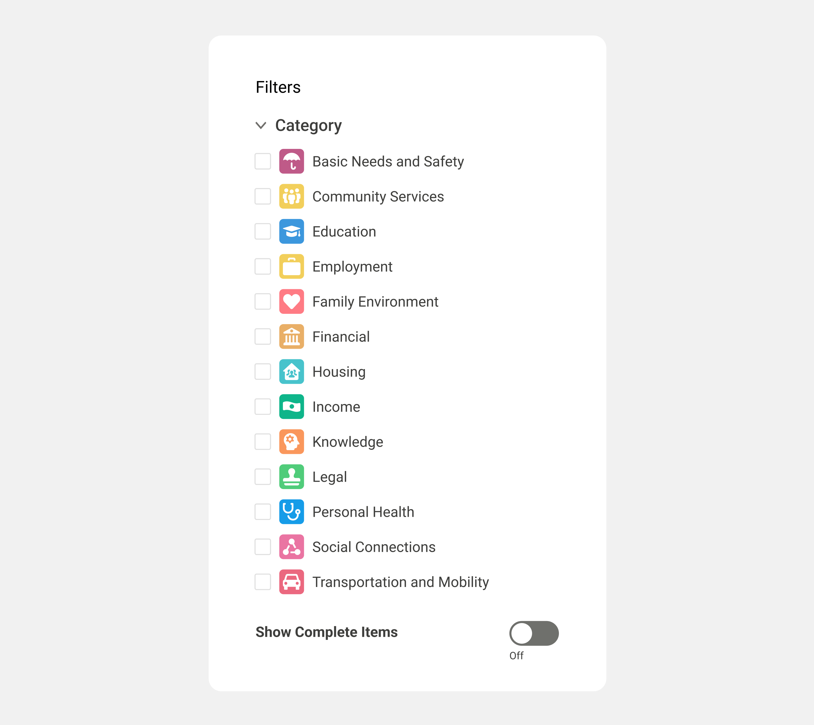 Clients needed a way to manage their plan conveniently and to minimize service fragmentation. The first step was digitizing the service plan that integrated referrals to various organizations and government agencies and presenting it cohesively. Items were presented in a digestible, well-organized list with a number of ways to filter content by topic and user objective.